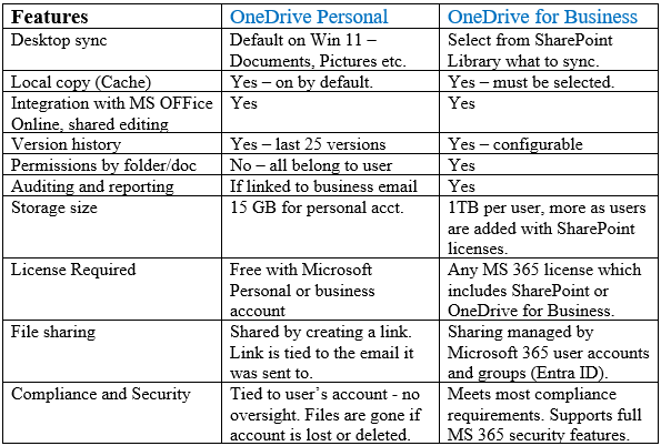 Security for OneDrive for Business files are set by the SharePoint Document Library security settings. Access to OneDrive for Business is based on the User’s MS 365 email address. Security groups are created and managed in the MS 365 user portal settings (now called Microsoft Entra). These users and groups are assigned rights to the Document library, folders, and files.