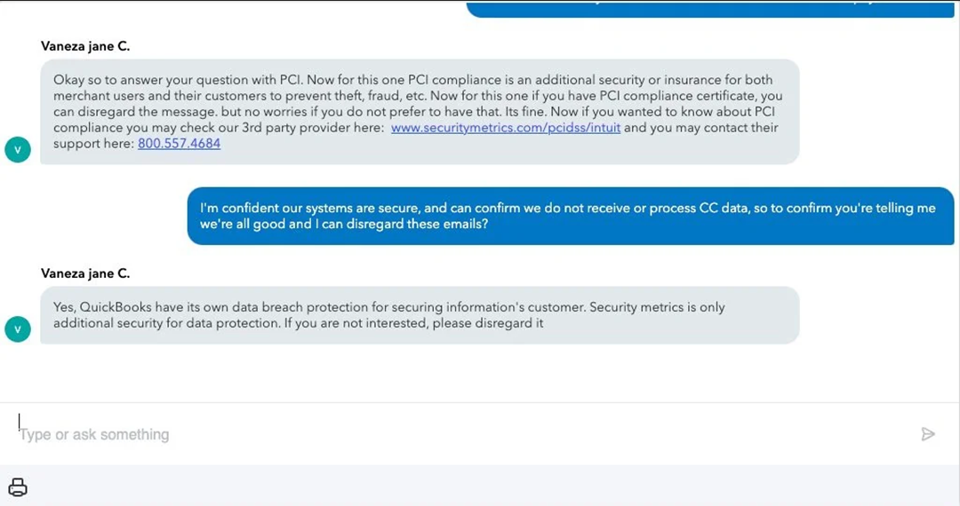 If you get emails from Quickbooks regarding SecurityMetrics for PCI compliance, you can ignore them. It is a shady marketing ploy to get you to sign up with SecurityMetrics. QuickBooks provides you with their credit card payment portal to take credit card payments, which is PCI compliant. Your computer doesn’t need to be “PCI compliant” if you don’t store Credit Card or other PCI data locally on your computer.