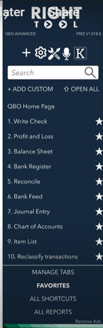 If you use QuickBooks Online, take a look at righttool. It’s a Chrome and Edge browser extension that provides a customizable toolbar for QBO, which is more flexible than the built-in menu.